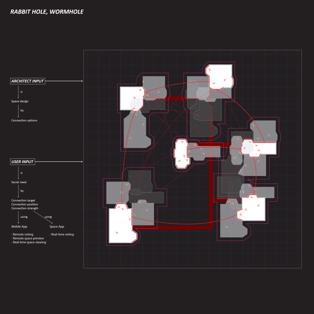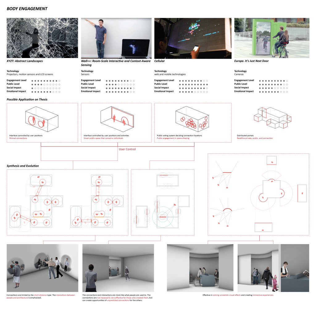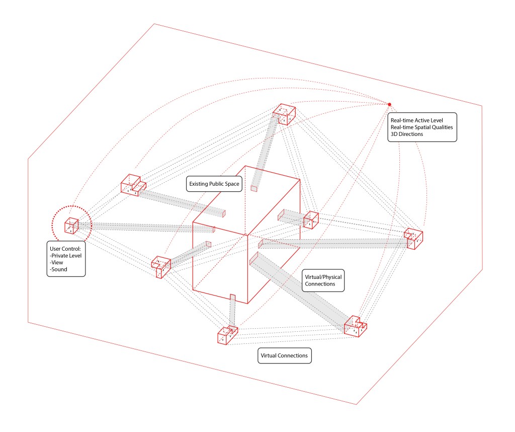 The future of our cities is uncertain, but we can already foresee that they will be dense and crowded. As designers for the built environment, we should be cautious that the increasing density does not disconnect people from people, or people from nature. In the thesis, the concept of ‘distributed integrated media space system’ is proposed as a way of building connections by distributing public spaces in high-density environments. An integrated media environment (IME) is a space where the physical environment and the virtual environment coexist. The research adheres the concept of designing experience in spaces, aiming to create diverse experience of spaces and interpersonal connections by using a distributed space system and integrated media environments. By applying IMEs in a distributed public system, traditional spatial concepts will be changed, including distance, neighborhood, accessibility, designer and user.